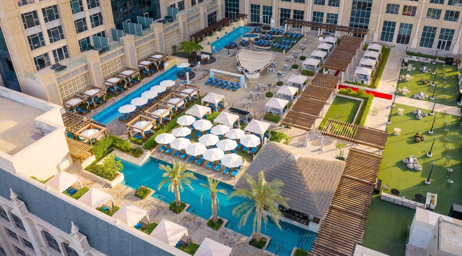 Take a serene escape at The Roof Gardens pool at Al Habtoor Palace.
