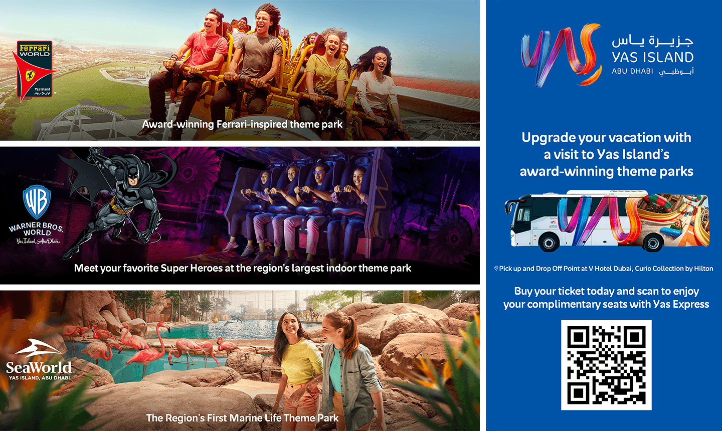 With one step away, buy your ticket and scan to enjoy your complimentary Yas Express Shuttle from V Hotel Dubai curio Collection